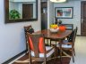 - The four-sitter modern wooden dining table set is perched on a brown accent rug. Mounted on the wall in the dining area is a dark wood-framed mirror