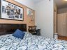- Zebra blinds dress the bedroom windows. A queen-sized dark wooden bed has its head board against a sepia-colored accent headboard wall. Mounted on the wall above the headboard is a framed abstract piece of art