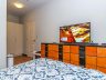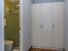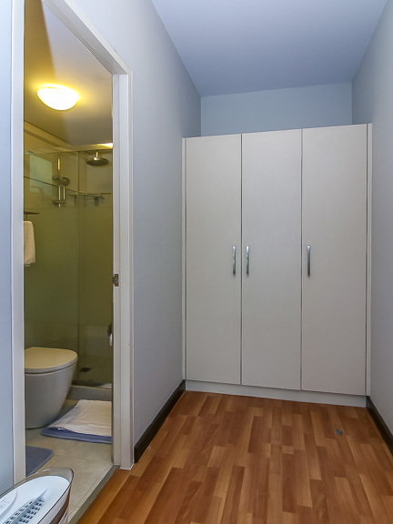 - Built-in cabinets also in sepia tones line the wall by the bedroom door near the bathroom