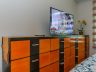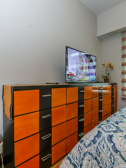 - Across the bed against the length of the wall is a black and orange-colored four-column cabinet, each with three-layered drawers
