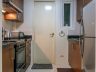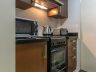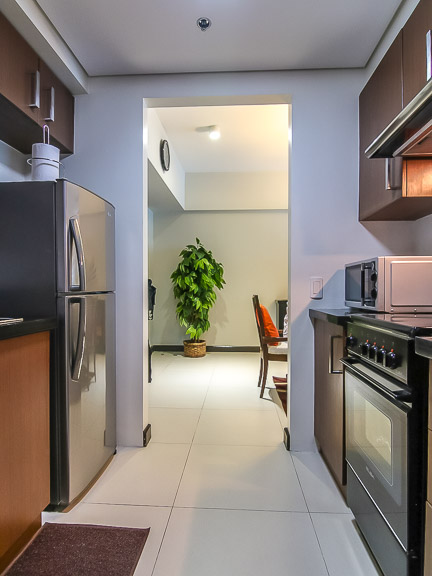 - Black granite counter-tops and vinyl-coated brown storage cabinets line the two-walled kitchen