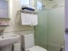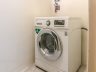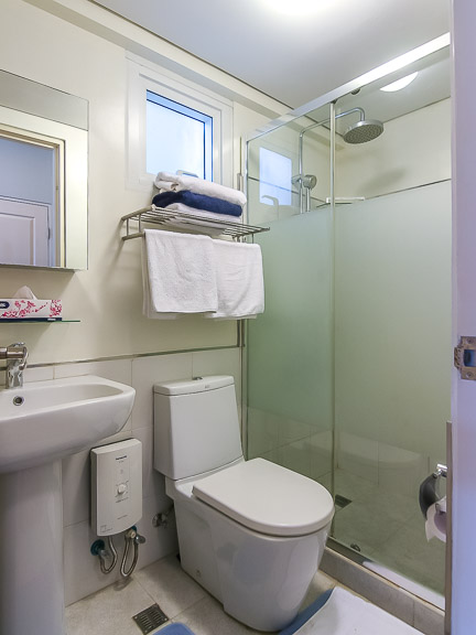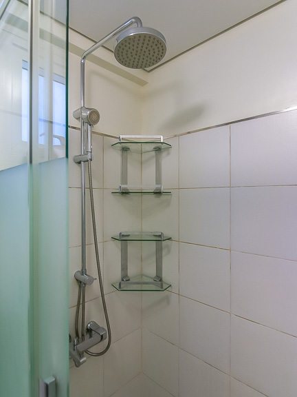 - The spacious bathroom with an added window ventilation, fitted with a fixed rainfall shower head, corner floating shelves and a shower enclosure