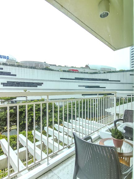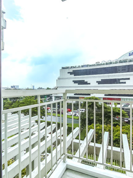 - Across the balcony with a wicker furniture set are the landscaped and pocket gardens, the city streets and the overwhelming facade of SM Aura