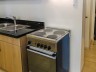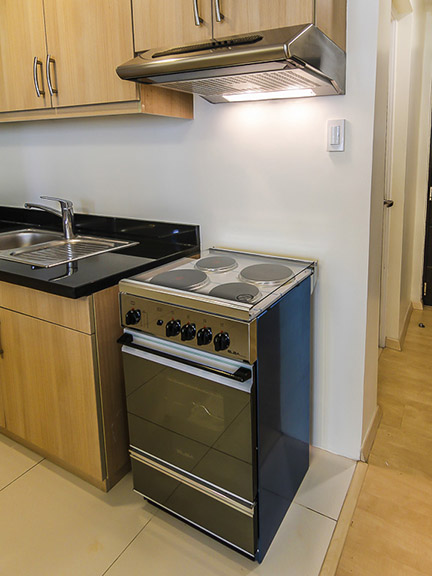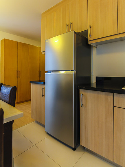 - Kitchen fitted with two-door fridge, electric range with hood and a bar counter