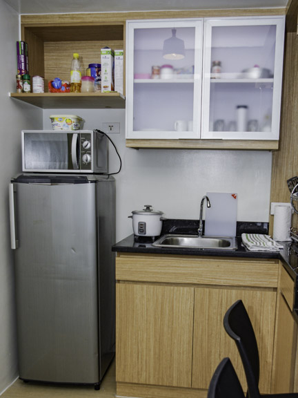 • Kitchen appliances include a refrigerator, microwave, counter-top stove cooker with range hood