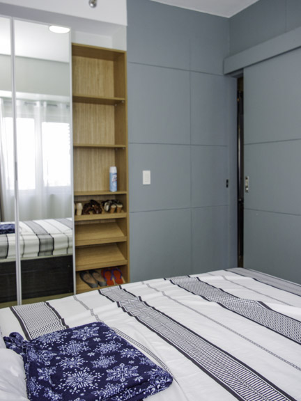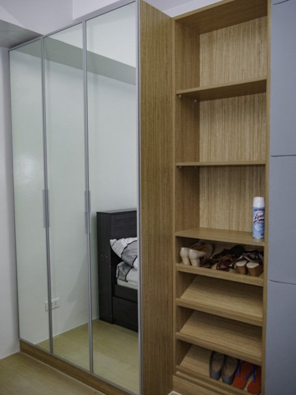 • Full twin storage bed, mirrored cabinet with multi-tiered shelving on the side in the bedroom