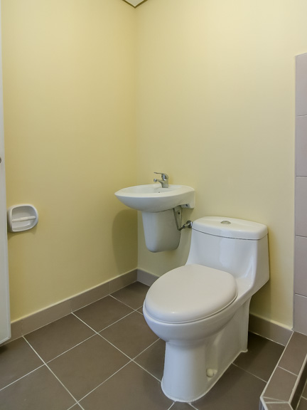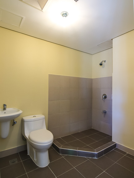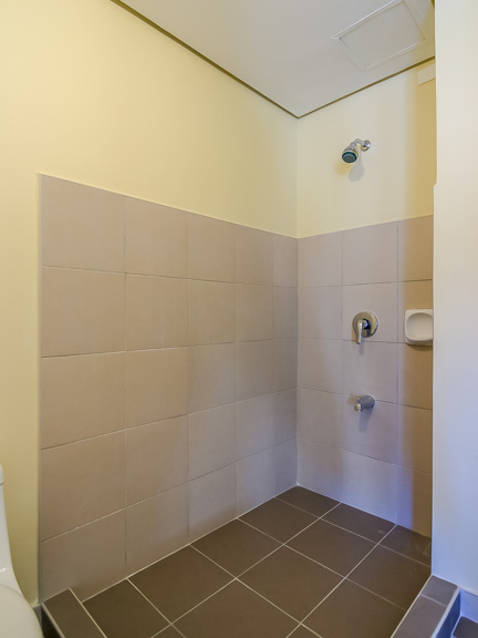 - Generously spaced bathroom with a fixed shower and wall-mounted sink