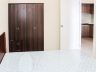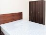 - The bedroom features a wood-framed queen-sized bed with a headboard and a darker-toned wardrobe cabinet with bottom drawers