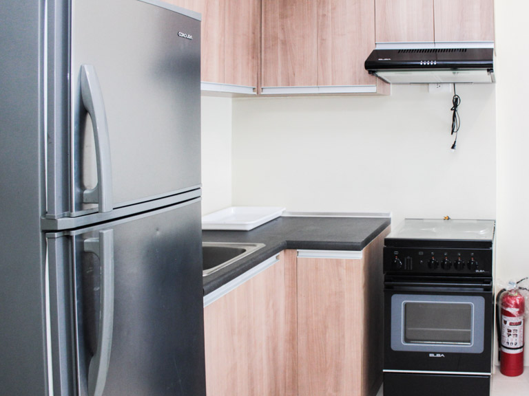 - The main door opens to an open corner L-formation kitchen with black granite counter-tops and vinyl-coated storage cabinets. Appliances include a two-door ref and an electric range with hood