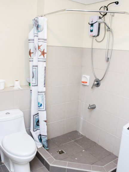 - The bathroom features a hand-held shower, shower curtain and water heater