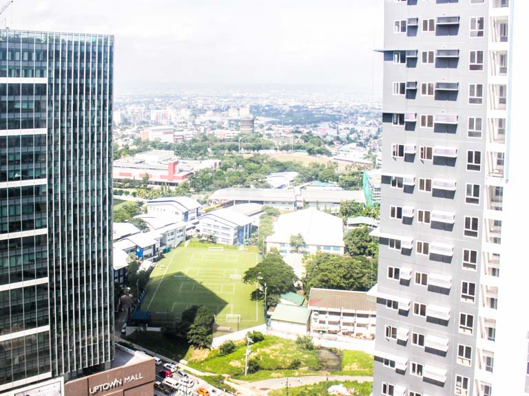 - A clear view of the distant city skyline and the nearby lush greens below is quite from the unit