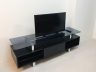- Maroon linen couch, flat screen TV, glass surface TV rack in living area Modern dining set with glass table and upholstered chairs