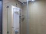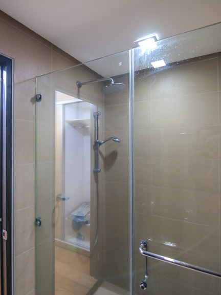 • Visible through the shower enclosure are the fixed rainfall shower and the hand-held shower