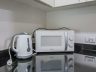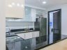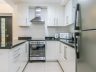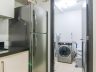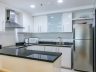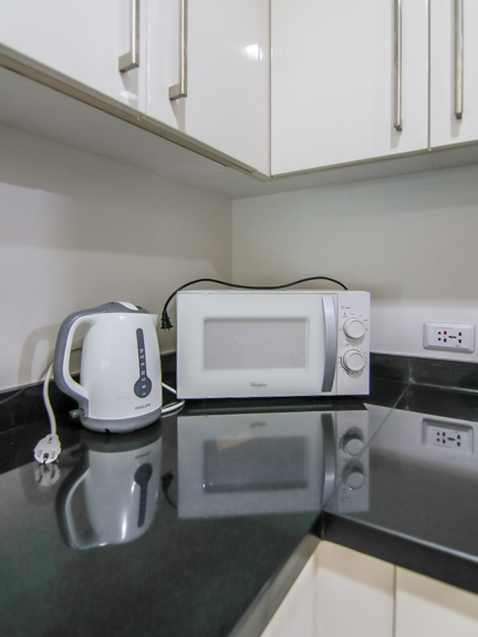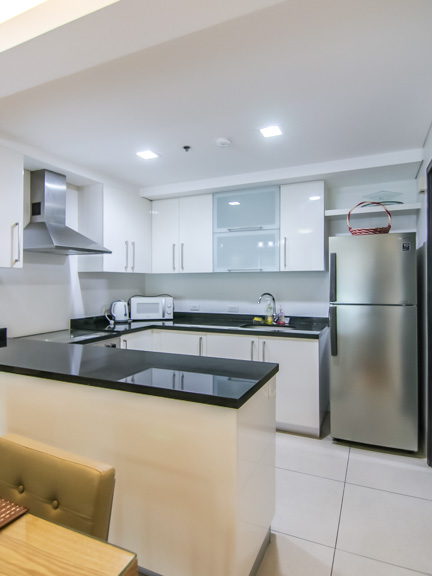 • Well-equipped kitchen with a C-shape configuration comes with two-door fridge, electric range with range hood, microwave, and plenty of cabinet space