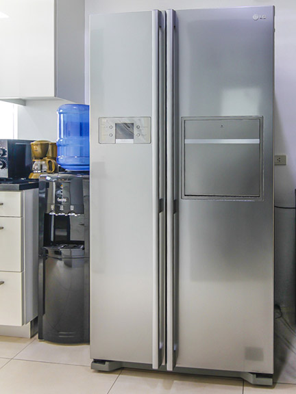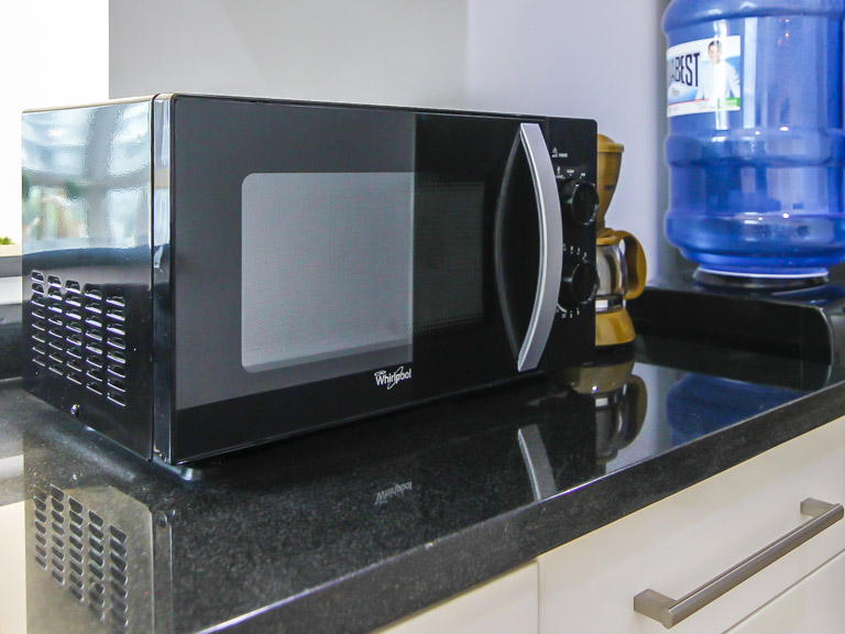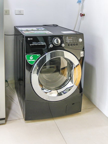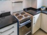 - Nice kitchen with side-by-side refrigerator, electric range with hood, microwave oven, front load washer and a pass through service window