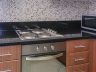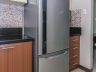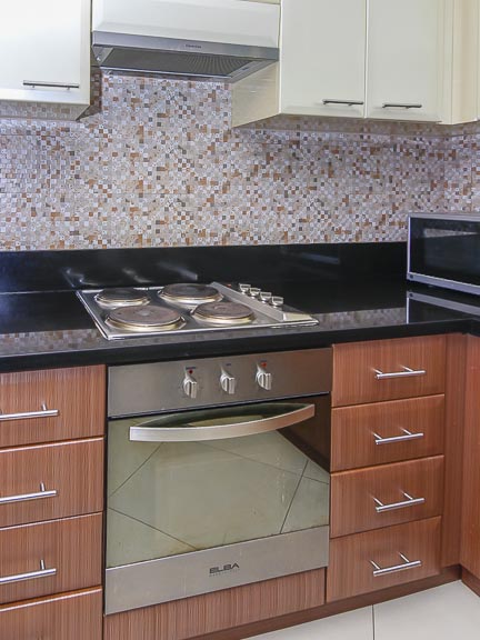 - Kitchen fitted with two-door ref, electric cooktop with hood, built-in conventional oven, and microwave