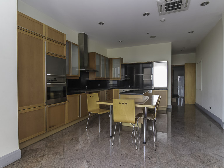 - An island cabinet bar and a four-sitter table make for additional working space. Kitchen appliances include an induction cook-top and a suspended range hood, a bottom freezer cabinet type refrigerator, a built-in oven and a dishwasher