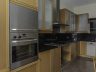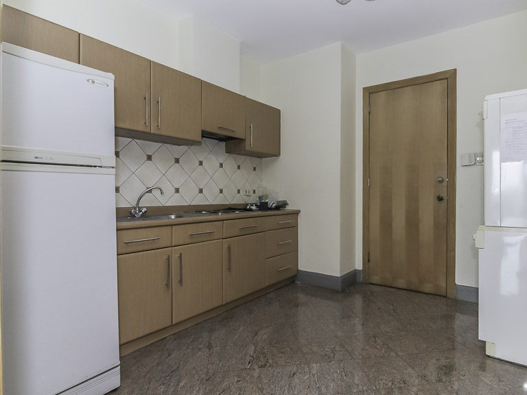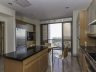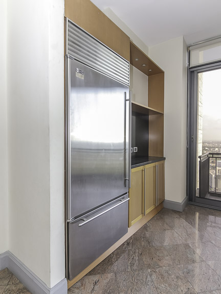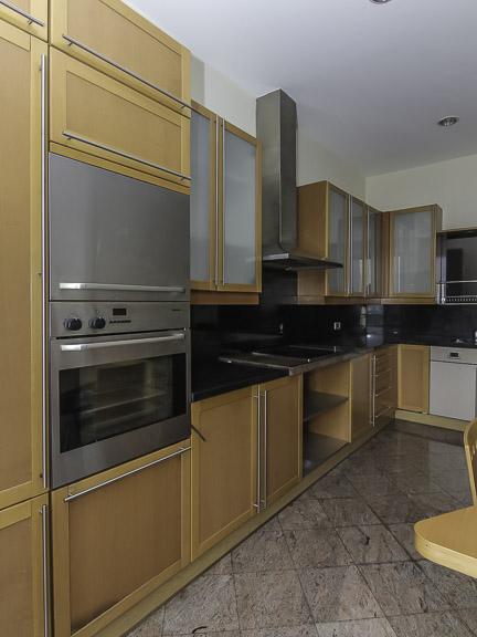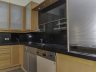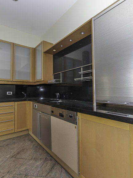 - Ceramic floor tiles establish the modern kitchen with black granite counter tops. Full glass sliding doors open to the balcony. Sandstone-colored cabinets, drawers and wall-mounted cupboards with opaque doors provide multiple storage