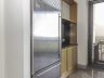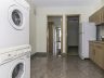 - A smaller single-walled kitchen with back-splash accent tiles also has a two-door refrigerator and an electric cook-top. Across this by the corner near the door are the stack-up washing machine and dryer