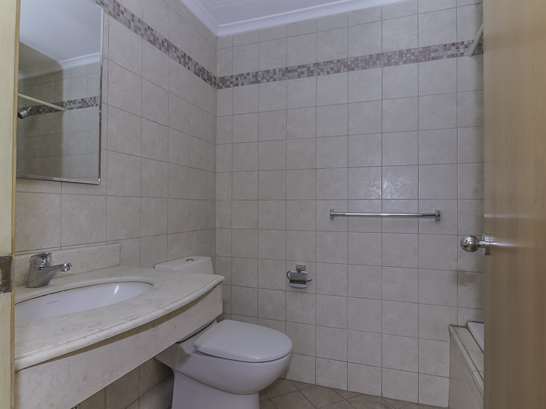 - Bedroom 2 is slightly smaller, with built-in cabinets along the small corridor leading to the private bathroom