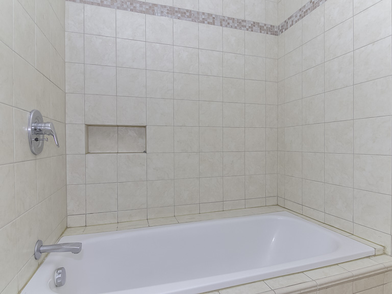 - Bathroom 2 has an alcove bathtub, a fixed mounted shower and a marble vanity counter with an oblong undermount sink