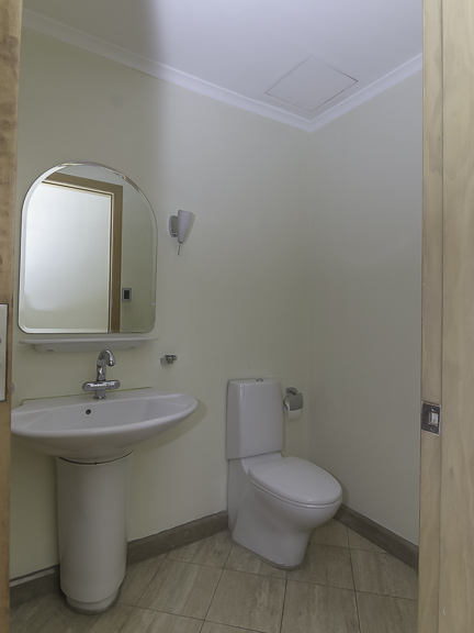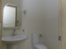 - In the powder room is a pedestal sink with a mirror above it, and a modern toilet