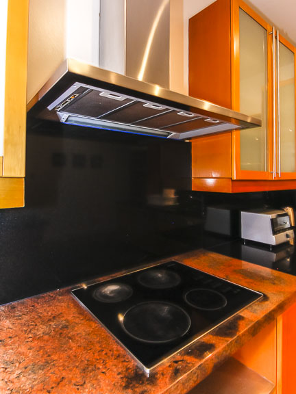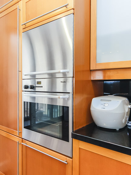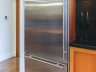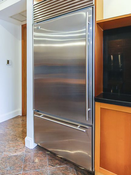 - Kitchen fitted with large two-door bottom freezer ref, induction cooktop with hood, built-in oven and microwave, dishwasher, and breakfast bar