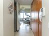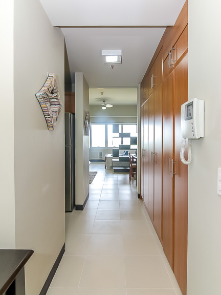 - The main door opens to a corridor lined on one side with built-in floor to ceiling honey-colored cabinets
