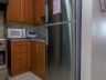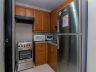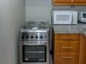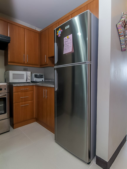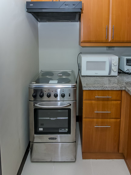 - The open kitchen is in an L-formation with grey granite countertop and storage cabinets. Good quality appliances include a four-burner range and hood, a microwave and a double-door ref