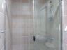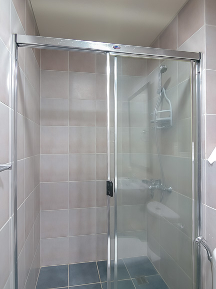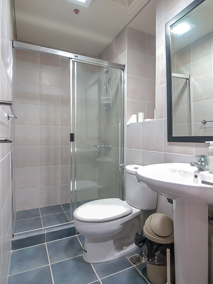 - The bathroom is a contrast of black floor tiles and blush wall tiles. Visible through the glass shower enclosure is the hand-held shower. Above the pedestal sink is a wide-framed mirror