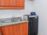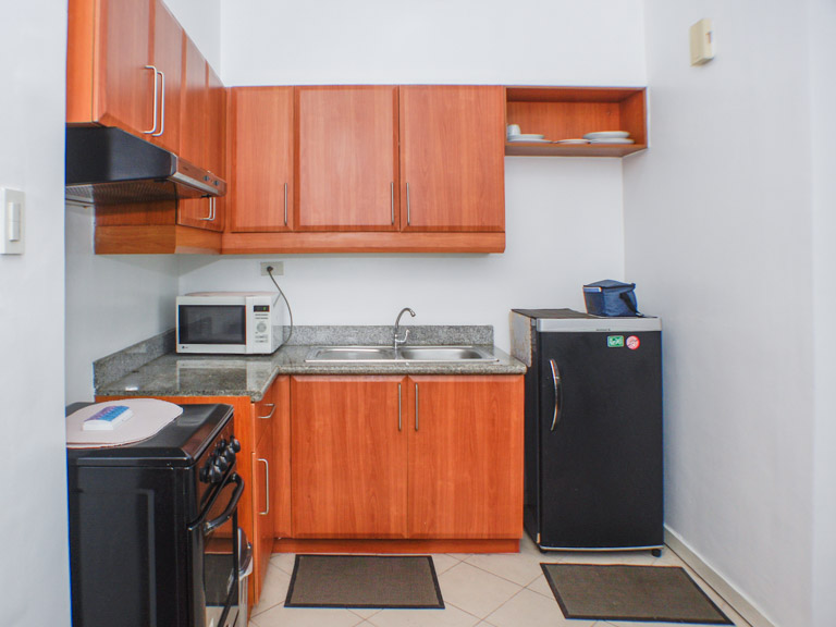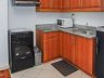 • Kitchen is equipped with electric range with hood, fridge, microwave
