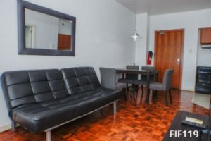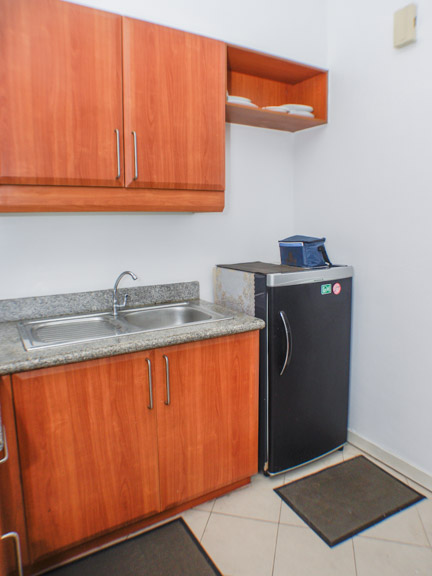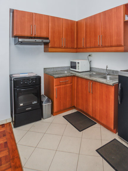 • Polished, dark wood flooring in the common area and bedroom; ceramic tiling on the kitchen area
