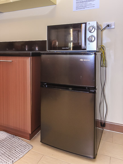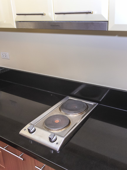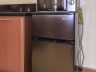 - Two-door fridge, microwave and electric cooktop with hood in kitchen area