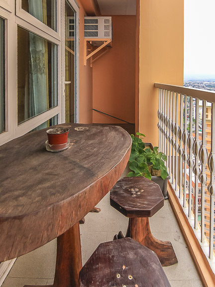 - Wood-styled furniture including a trundle-type daybed, and tree-stump styled outdoor dining set
