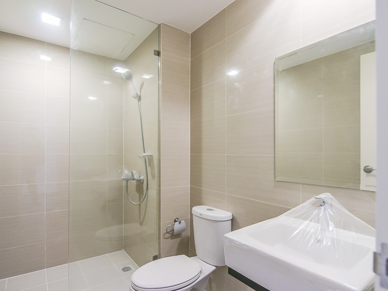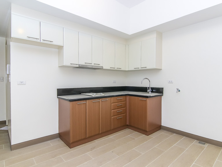 - Corner kitchen area with good countertop and cabinet space; comes with an electric cooktop with hood, and provisions for fridge and washing machine