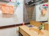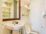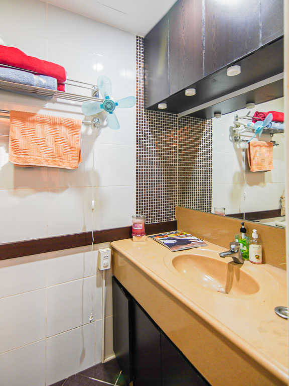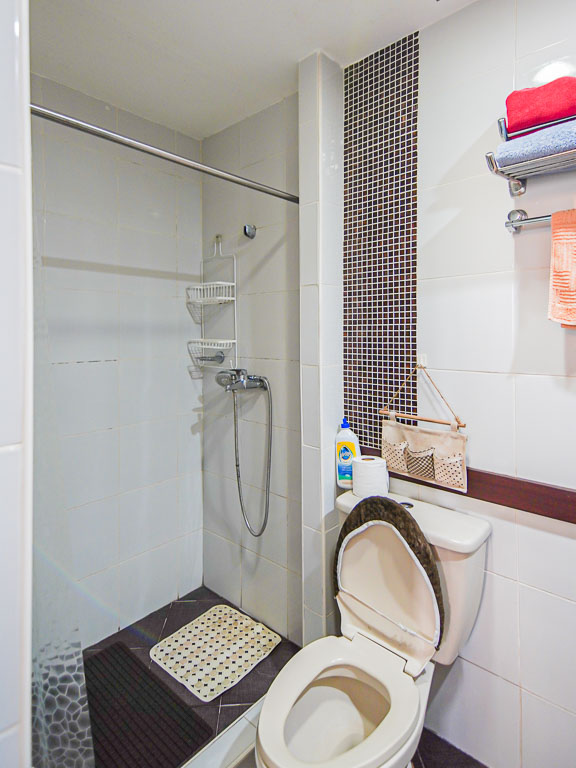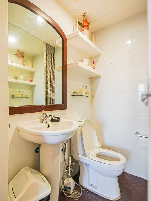 - The unit has two bathrooms, one by the bedroom, and a powder room by the entrance