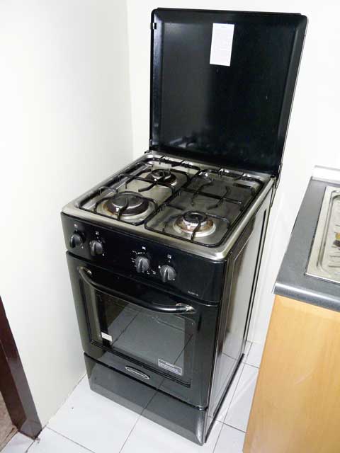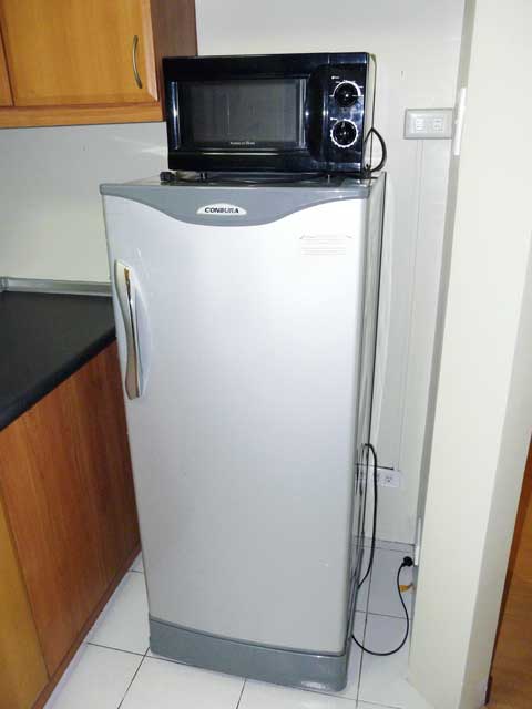 - Kitchen area with stove, microwave and refrigerator