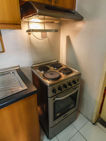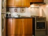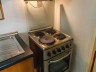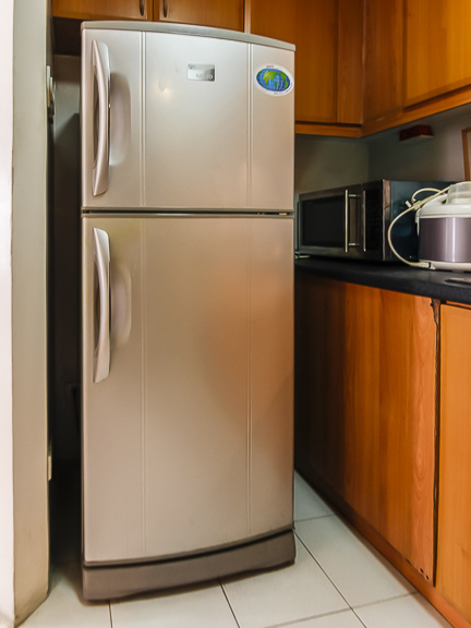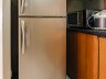 - Two-door fridge, microwave and electric range with hood in kitchen