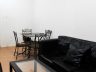 - A round metal-framed glass table and two matching chairs occupy window side. Other living room furniture include a black leather couch, a dark sideboard with the flat screen TV, and a glass top center table