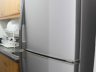 - Vinyl-coated base cabinets under a grey granite counter top, and mounted cupboards provide kitchen storage space. A two-door refrigerator stands on the floor by the edge of the kitchen counter
