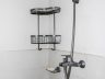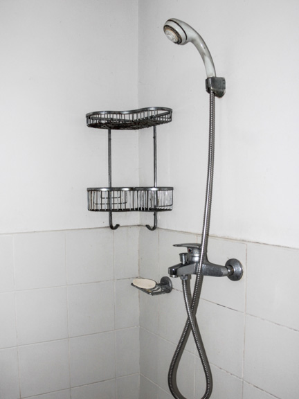 - The white-walled bathroom is fitted with a hand-held shower and stainless steel corner shelves