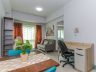 - Across the dining table, parallel with the sofa is an office desk with a side drawer and cabinet and a swivel chair