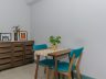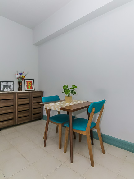 - The dining set is a two-sitter wooden table and chairs with aqua blue upholstery. Leaning on the wall behind the dining set is a brown console-like table with three-drawer columns