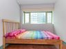 - Between the sofa and the office table is the door to the bedroom. A twin-sized latte-colored platform bed is near the wall to wall glass panel with bottom latched windows