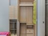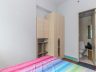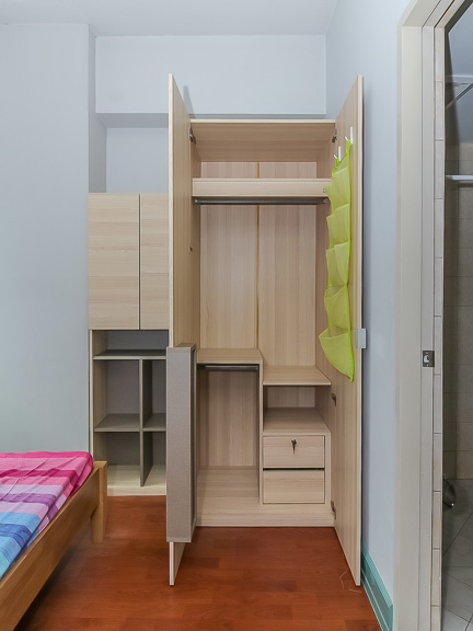 - The corner near the bathroom is occupied by wardrobe cabinets and cabinet shelves