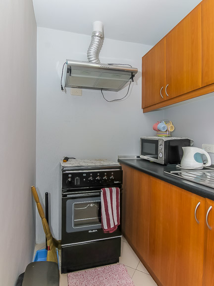 - The kitchen is lined along one wall with syrup-colored mounted cupboards and base cabinets under a black granite counter-top. Appliances include a two-door refrigerator, a microwave and an electric range with a suspended hood