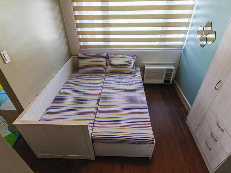 • Single pullout bed that transforms into a full twin bed with pillows and linens in bedroom