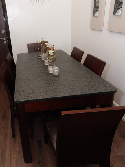 - The living/dining room is fitted with a plush leather sectional sofa, flat-screen TV with sound system, and a six-seater dining set