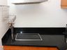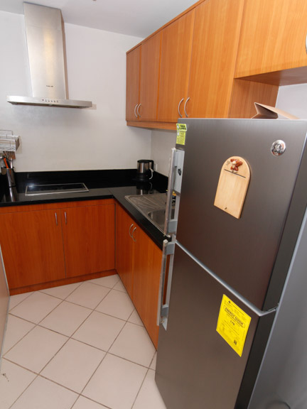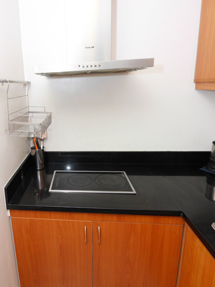 - The kitchen is equipped with an induction cooktop, range hood, and two-door refrigerator
