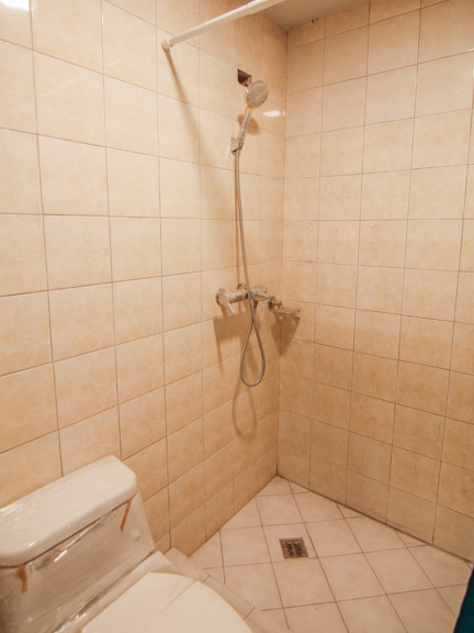 • The bedroom contains a queen-sized bed, chest of drawers and shaded lamp